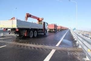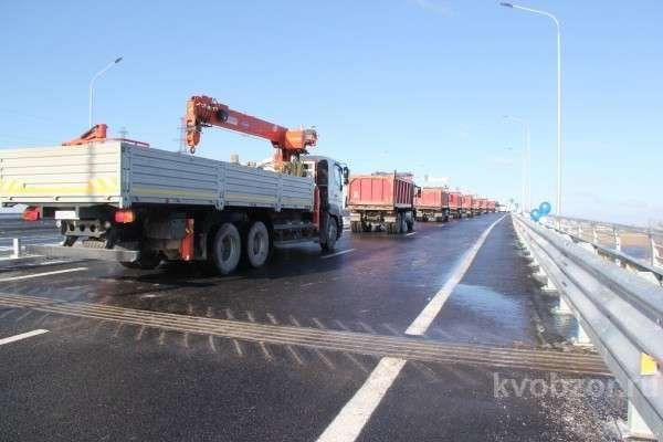 После торжественного пуска, по мосту традиционно прошла колонна грузовых авто и пассажирского транспорта, демонстрируя надежность нового объекта.