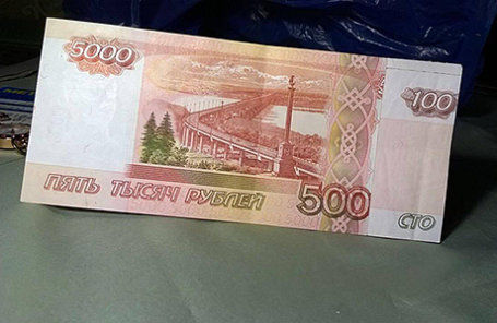 Москвичка Елена Федонина получила странную купюру из банкомата в торговом центре у станции метро "Печатники". Банкнота состояла из двух частей: 5-тысячной купюры и приклеенного к ней куска сторублевки. Фотографии "гибрида" она выложила на своей странице в Facebook.