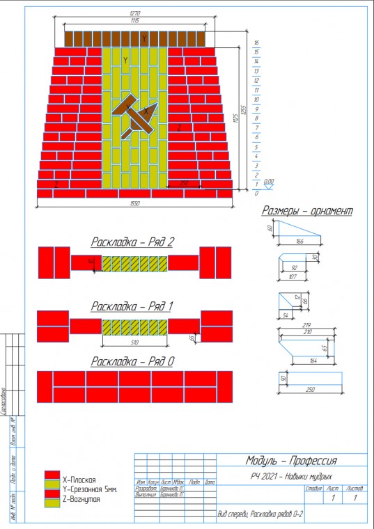 Конкурсное задание включает в себя кладку модуля из кирпича: в полкирпича, в кирпич, горизонтально, вертикально (стоймя), с элементами декоративной кладки, кладкой орнамента из кирпича, с разными видами расшивки швов.