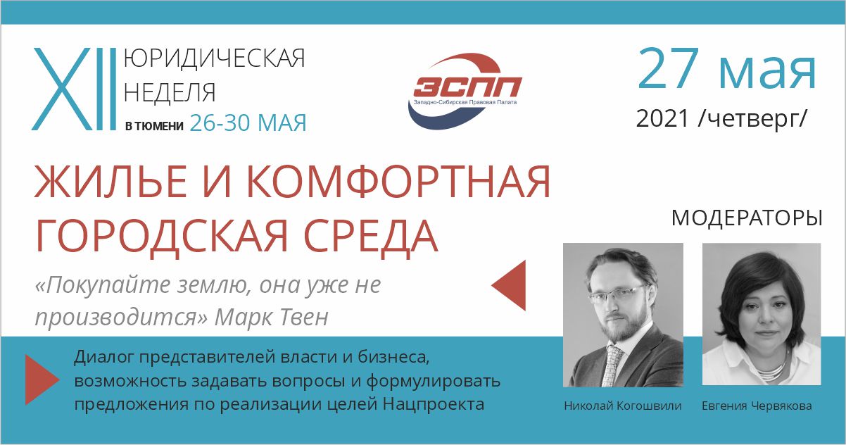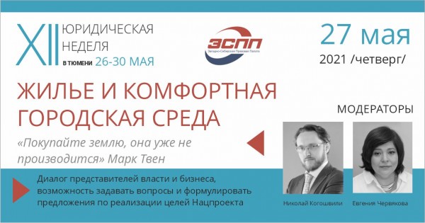 Постоянной традицией Юридической недели в Тюмени является рассмотрение хода и юридических аспектов реализации Национальных проектов России. На XII Юрнеделе 27 мая 2021 года будет рассматриваться реализация проекта «Жилье и городская среда» на территории региона.