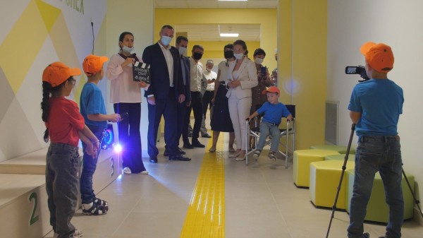На втором этаже детского сада гости увидели, как воспитанники знакомятся с профессией «журналист», создавая социальный видеоролик «Я люблю спорт!». Юный корреспондент Иван провел интервью с главой города и узнал, что для Руслана Николаевича очень важен спорт, а самыми любимыми увлечениями являются плавание и прогулки на велосипеде. Сам Иван занимается футболом и бегом, для таких тренировок в новом детском саду созданы все условия.