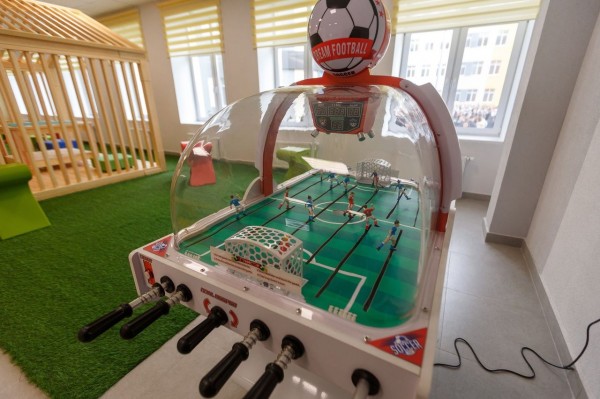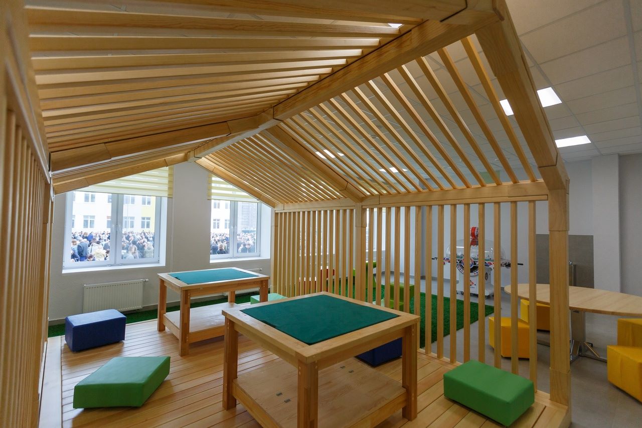 В начальной школе второго корпуса гимназии №4 на улице Арктической, 3, отдельный вход, это очень радует родителей. Классы оборудованы смарт-досками, на которых можно не только писать, но и демонстрировать аудио и видео. Сегодня старшеклассники подарили первоклашкам шахматы, они будут стоять у малышей в каждом классе. Интересно, что для настольных игр оборудована стильная рекреация в виде деревянного домика. Рядом – скалодром и спортзал, в котором планируют проводить занятия самбо.