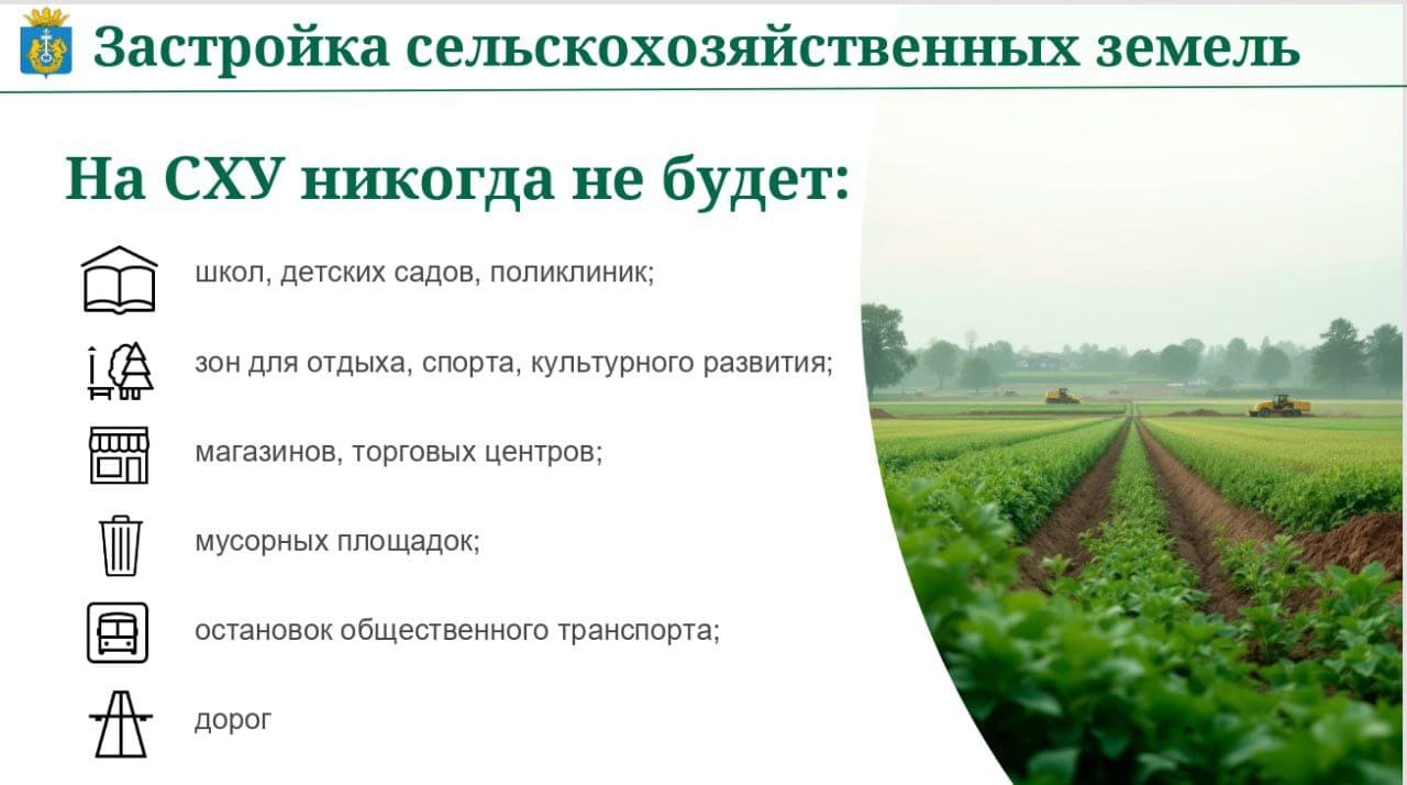 В выступлениях спикеров прозвучало напоминание о том, что земли сельхозугодий не предназначены для возведения жилья, построенные на них дома не будут узаконены.