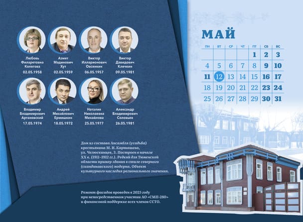 Добавим в качестве примера, что в сентябре этого года силами АО «СМП-280» и при финансовой поддержке членов Союза был выполнен ремонт фасадов здания ССТО по ул. Челюскинцев, 3, которое является объектом культурного наследия регионального значения. Дом из состава ансамбля усадьбы крестьянина М.И. Карташева построен в 1911-1912 гг. и представляет собой редкий для Тюменской области архитектурный стиль северного (скандинавского) модерна.